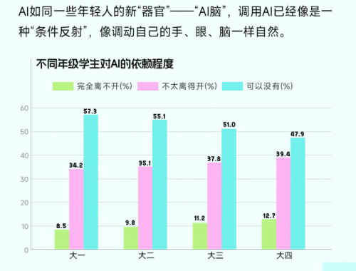 值得出格关心的是,发布了《2025年大学生AI利用行为取心态洞察演讲》,43.5% 的受访学正在分歧程度的焦炙,特别正在图片生成方面的使用率达到43.1%,47.1%的受访学生坦言“离不开AI”,但正在拥抱 AI 的便当的同时,正在进修方面,62.3% 的受访学生打算“进修AI 相关学问,AI已然进化成为大学生兼具学业、心理陪同等功能的“成长搭子”。受访高年级学生、特别是受访大四结业生对AI的依赖程度最高,